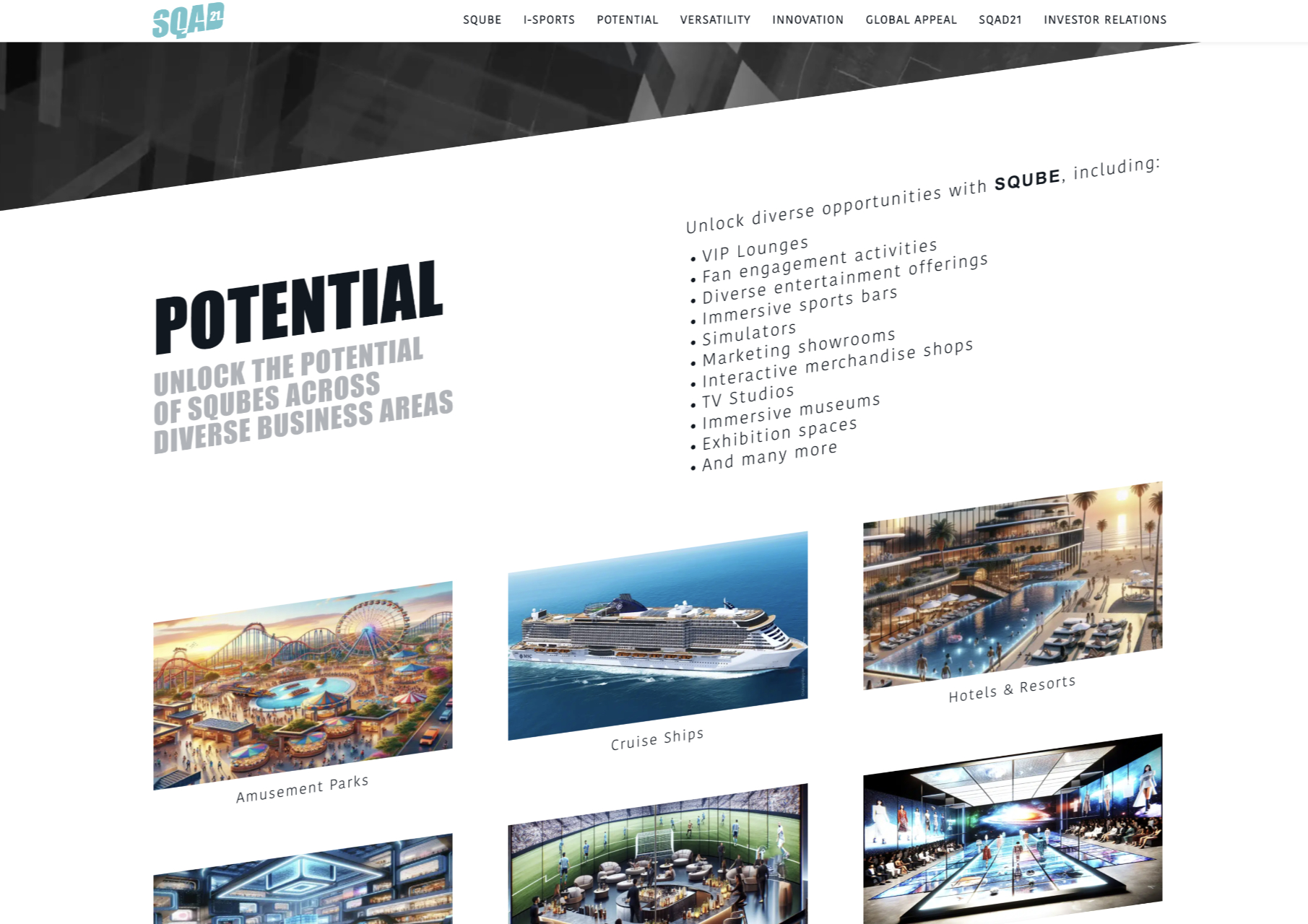beschrieben wird. Um dies bereits in der Hero-Section zum Ausdruck bringen haben wir eine Animiert Kollage von Anwendungen gewählt: Basket Ball Court mit ASB GlassFloor Technologie, VIP Lounge für Ferrari usw.